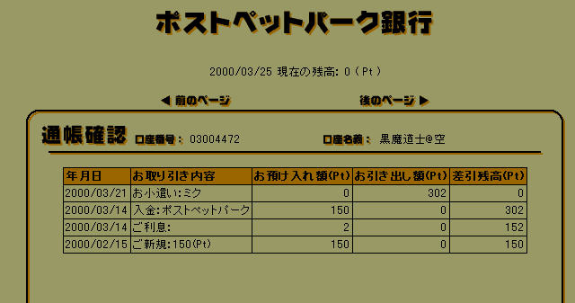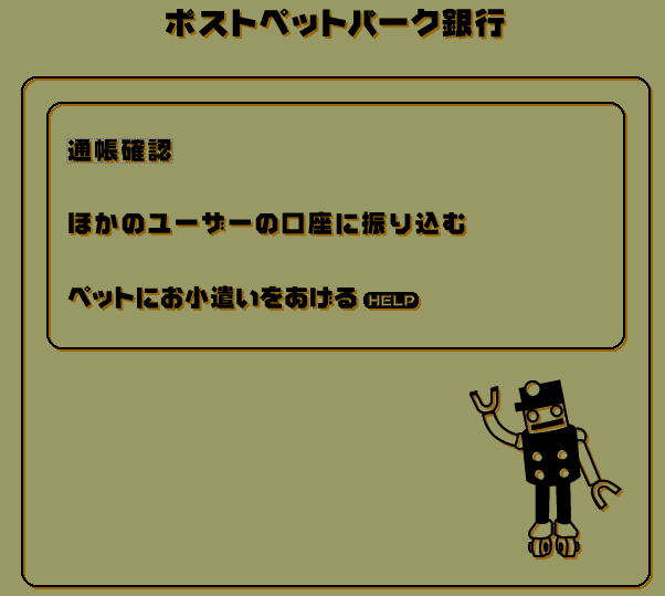 | ポストペットパーク銀行はPt(ペッチ)の銀行です。 口座にたまったPtは、自分のペットにお小遣いとしてあげたり、 ほかのユーザーの口座に振り込んだりできます。 口座が開設された時点で、150Ptが自動的に入っています。 その後、毎月第2水曜日(パーク休園日の翌日)にポストペットパークより、 150Ptを入金させていただきます。利子は、月1%です。 |