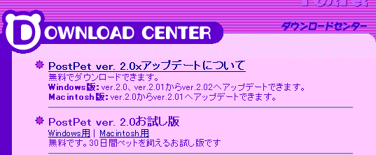 | 正式版に変更するには・・・ 30日の使用期限が切れる前に、パソコン専門店またはCD-ROMショップ等で 「PostPet 2001」をご購入下さい。 付属のマニュアルに、「インストールのやりかた」というページがありますので、 そこの「アップデートのやりかた」をご覧ください。 この変更により、それまで育てたペットをそのまま続けて飼うことができます。 |