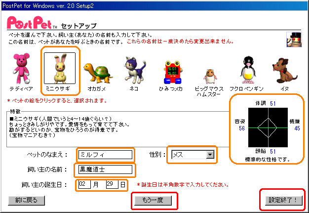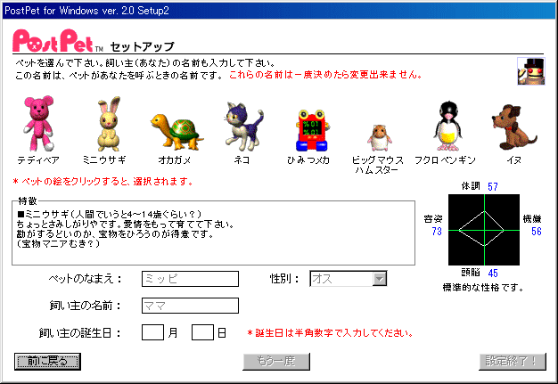 | ペットの設定は一度決めたら変更できません。よく考えて入力してください。 | |