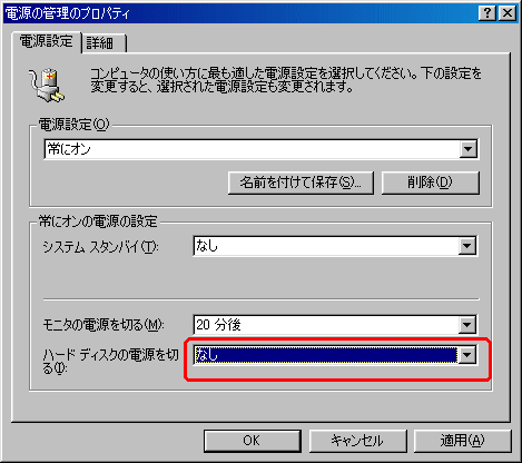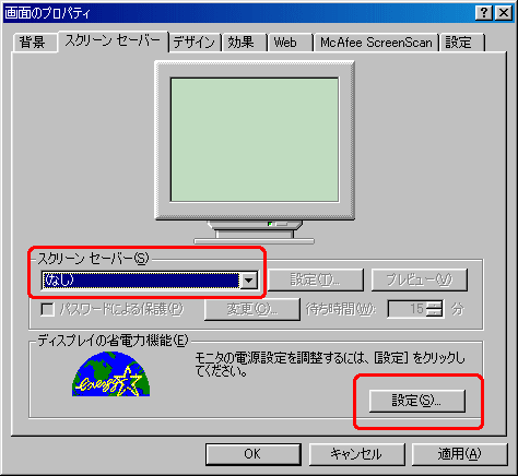 長時間使用しない時にディスプレイやハードディスクの電源の供給を止める設定に なっています。長時間作業するスキャンディスクなどの時は止まらないように設定しましょう。