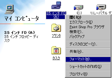 | 3.5インチFDの上で右クリックして フォーマットを左クリックで選択します |